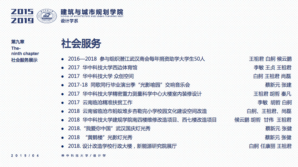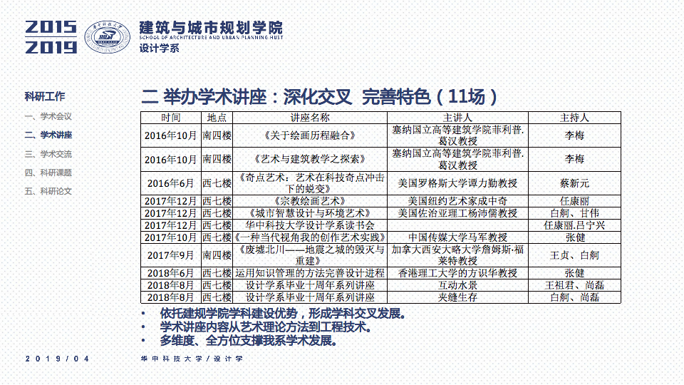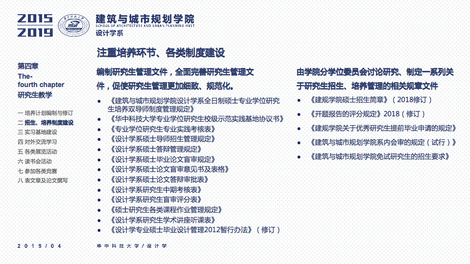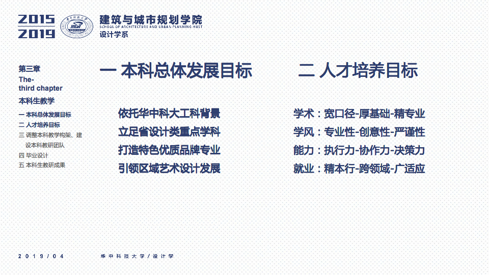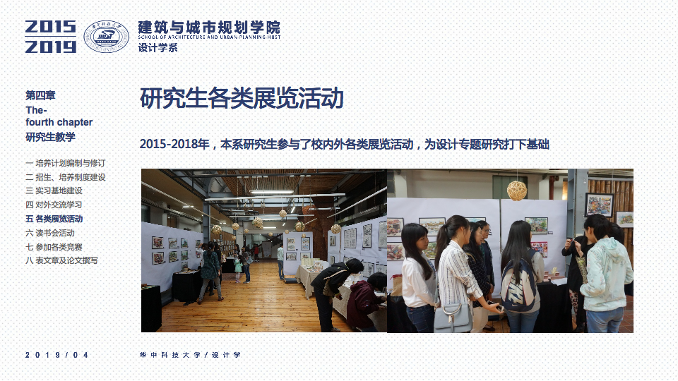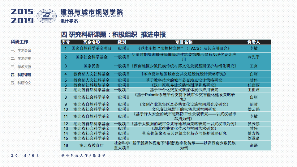 秉承设计学系“学科交叉、突出特色、创新为本”的办学要求,立足于“湖北省品牌学科”、“湖北省重点学科”的基础之上,一直坚持“打造特色优势学科方向及团队”作为团队建设与科研工作的立身之本。四年以来,重点围绕以评促建、本科教学、研究生教学、科研工作、团队梯队与平台建设、成果总结、社会服务等七个方面来开展工作,在以评促建的工作体制下,举全系之力,参与全国高校设计学专业公司等级的排名评估,首次参加第四轮学科评估即获得“B-”等级(并列全国28位),同时通过了设计学学位点合格评估,并组织开展了博士点申报等各项工作。为下一轮评估与申报打下了坚实的基础并取得了宝贵的经验。