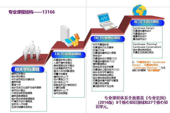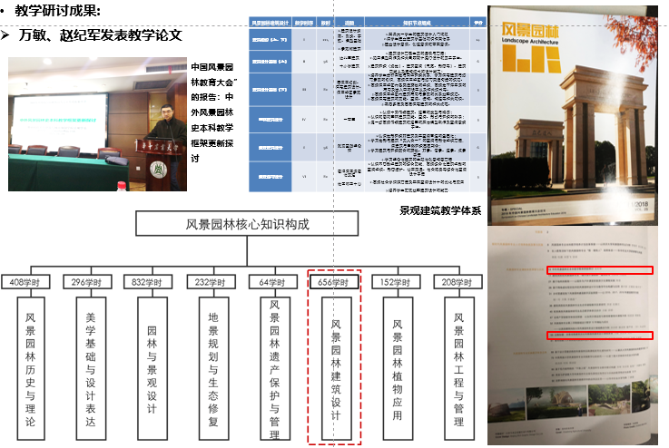 在四年的时间里,本科教学以景观建筑教学小组和风景园林规划设计教学小组为抓手开展一系列的教研活动,并取得相应的教研成果。景观建筑教研小组万敏教授、赵纪军教授发表高质量的教学论文,其中万敏教授提出了以建筑初步(上、下)、建筑设计基础(上、下)、地景建筑设计、园林建筑设计、景观城市设计等7门核心知识教育课程为结构的景观建筑教育体系,赵纪军教授在中国风景园林教育大会上以“中外风景园林史本科教学框架更新探讨”为题进行了报告交流。结合风景园林规划设计教学小组的研讨,由熊和平副系主任完善了本科教学大纲,形成了“横向拉通,前大后小;纵向搭配,均衡分布”的专业课程体系结构及课程设置。