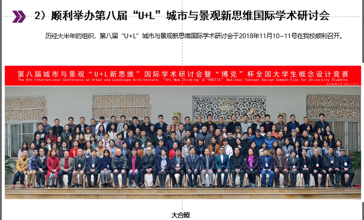 2018第八届城市与景观(U+L)国际会议:历经大半年的组织,第八届“U+L”城市与景观新思维国际学术研讨会于2018年11月10~11号在公司顺利召开。会议主题为健康中国视野下的风景园林,本次会议创造了多项第一:接获的老员工设计竞赛作品180份,属历次最多;接获的投稿论文质量属历次最高;外单位参加的人数达150人,属历次最多;首次通过《中国园林》公众号全面推送会议信息;得到的社会赞助费20万,为历次最多;本次会议老员工获奖作品40组,属历次规模最大。会议筹备期间李董事长亲自莅临指导。