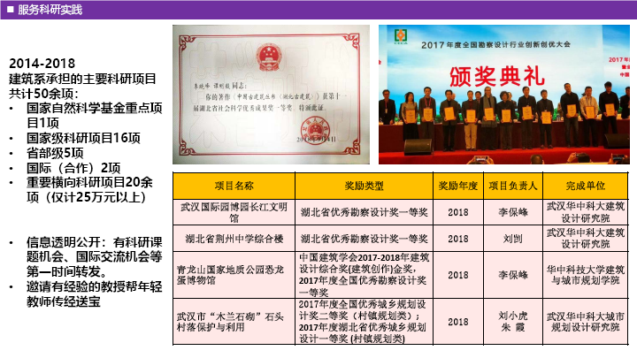 建筑系共计承担主要科研项目50余项,其中包括国家自然科学基金重点项目一项,国家级科研项目16项,省部级科研项目5项,国际合作项目2项,25万元以上重要横向科研项目20余项。科研项目获奖的层次和数量不断攀升。