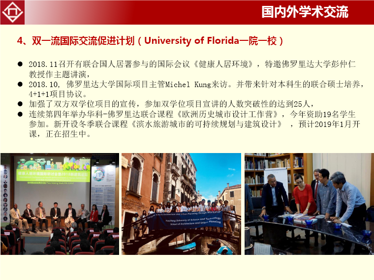 依托双一流国际交流促进计划,和美国佛罗里达大学在双学位、国际会议、教授互访、国际联合课程、联合工作营方面展开了一系列工作。