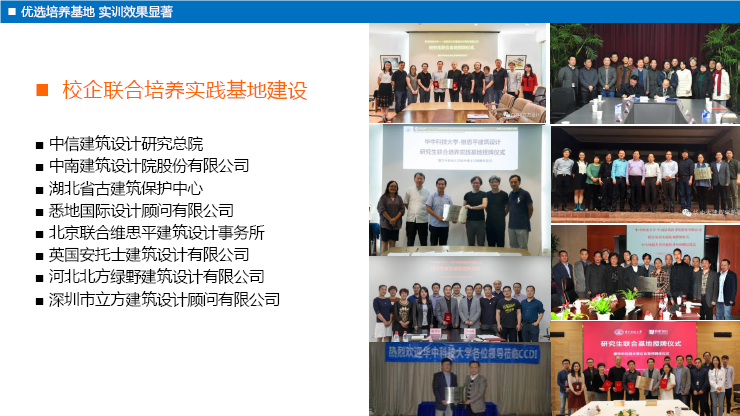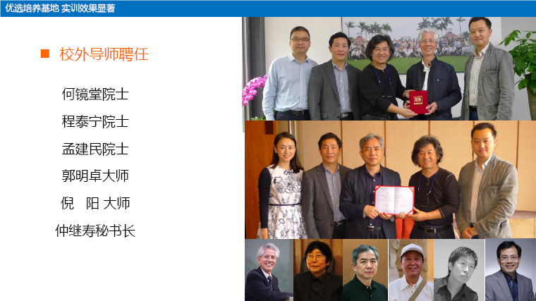 建设了大批校企联合培养实践基地,强化研究生企业实践;建立高校和企业双导师制,并聘任何镜堂、程泰宁、孟建民、郭明卓、倪阳、仲继寿等院士和大师为校外导师。