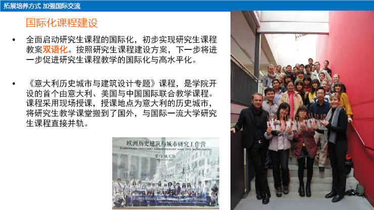初步实现了研究生课程教案双语化,《欧洲历史城市与建筑设计专题课程》在欧洲授课,与国际一流大学研究生课程并轨。