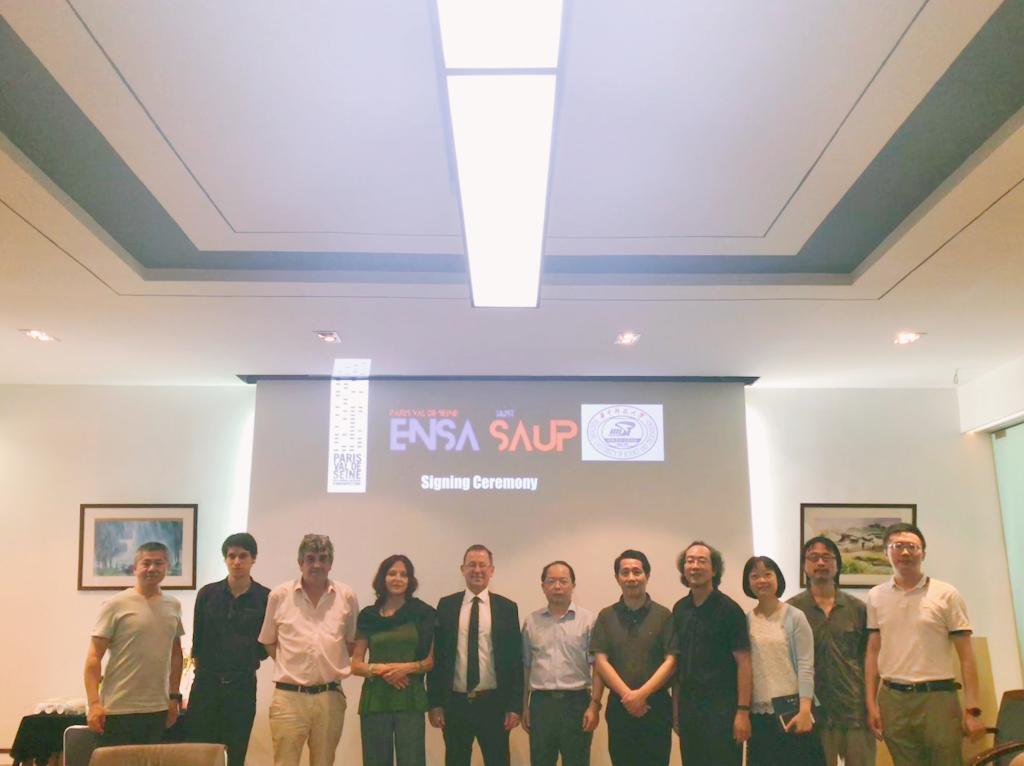 法国瓦尔德塞纳高等建筑学董事长Philippe Bach与教授Martine Bouchier、Pierre Vincent以及国际交流部负责人Arnaud Miseriaux,taptap点点体育黄亚平经理、李晓峰副经理、汪原教授、戴菲教授、赵守谅副教授、白舸副教授和刘小虎副教授共同出席了加强两校深入合作签约仪式。