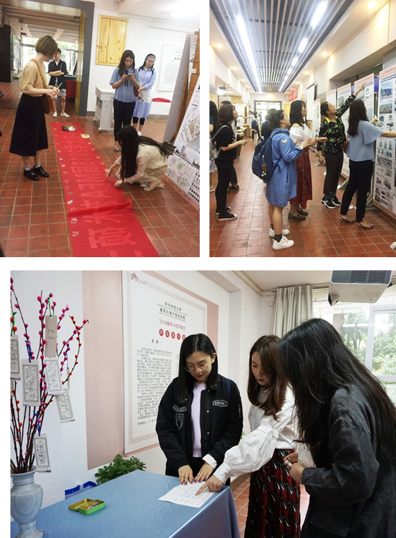 展览活动当天,设计系的同学们一早就来到现场,迎接前来看展的各位教授、设计院领导、各兄弟院校的老师和同学们。进入展厅,老师们签名留念,随后任意选取一支书签,对应着本次参展同学,进行深入指导。同学们非常热情的为老师们做全程讲解,现场学习气氛浓烈,增进了设计学系师生与建筑学系、规划系、景观系老师们的互动与交流,同学们都收获满满。