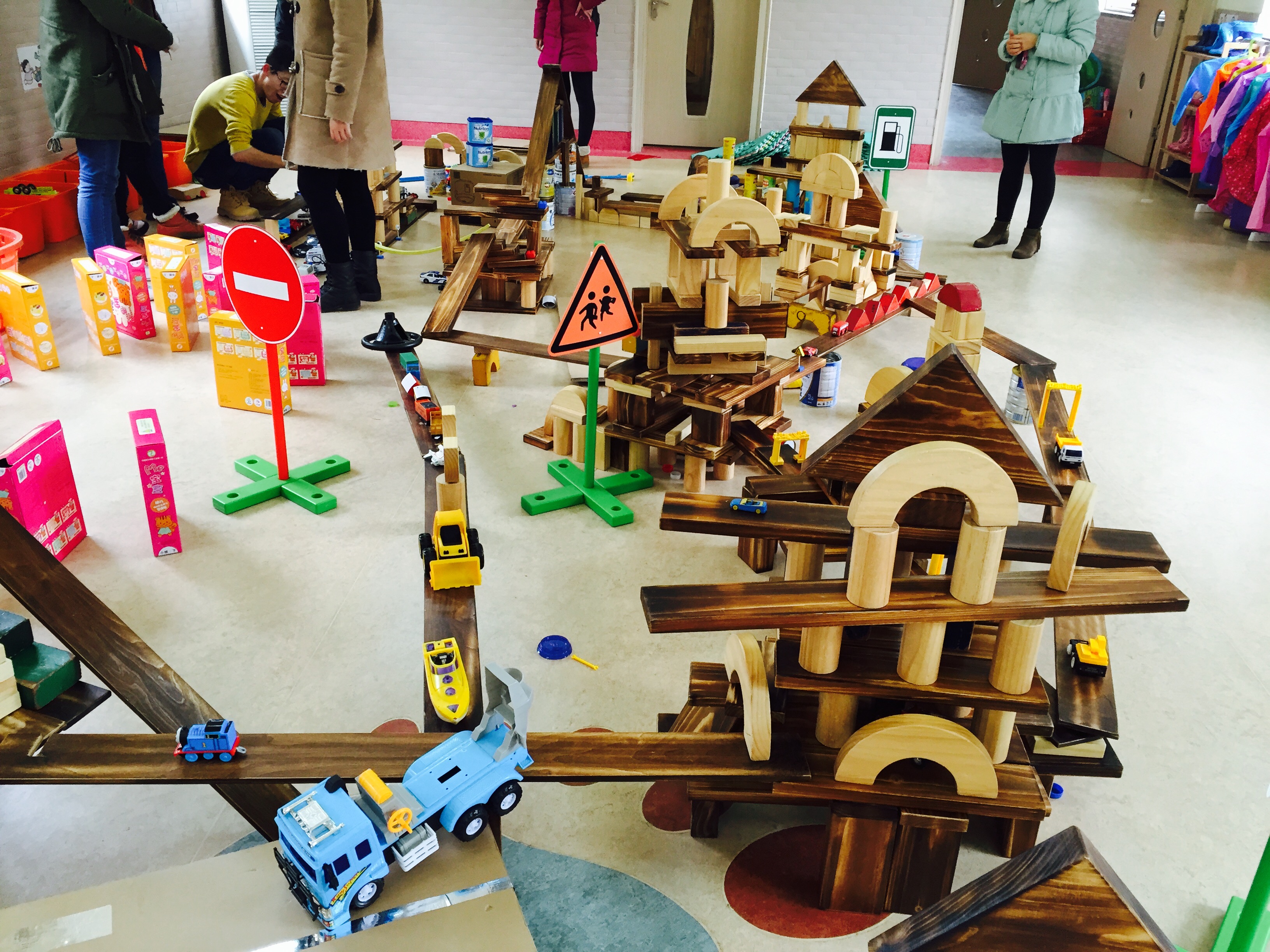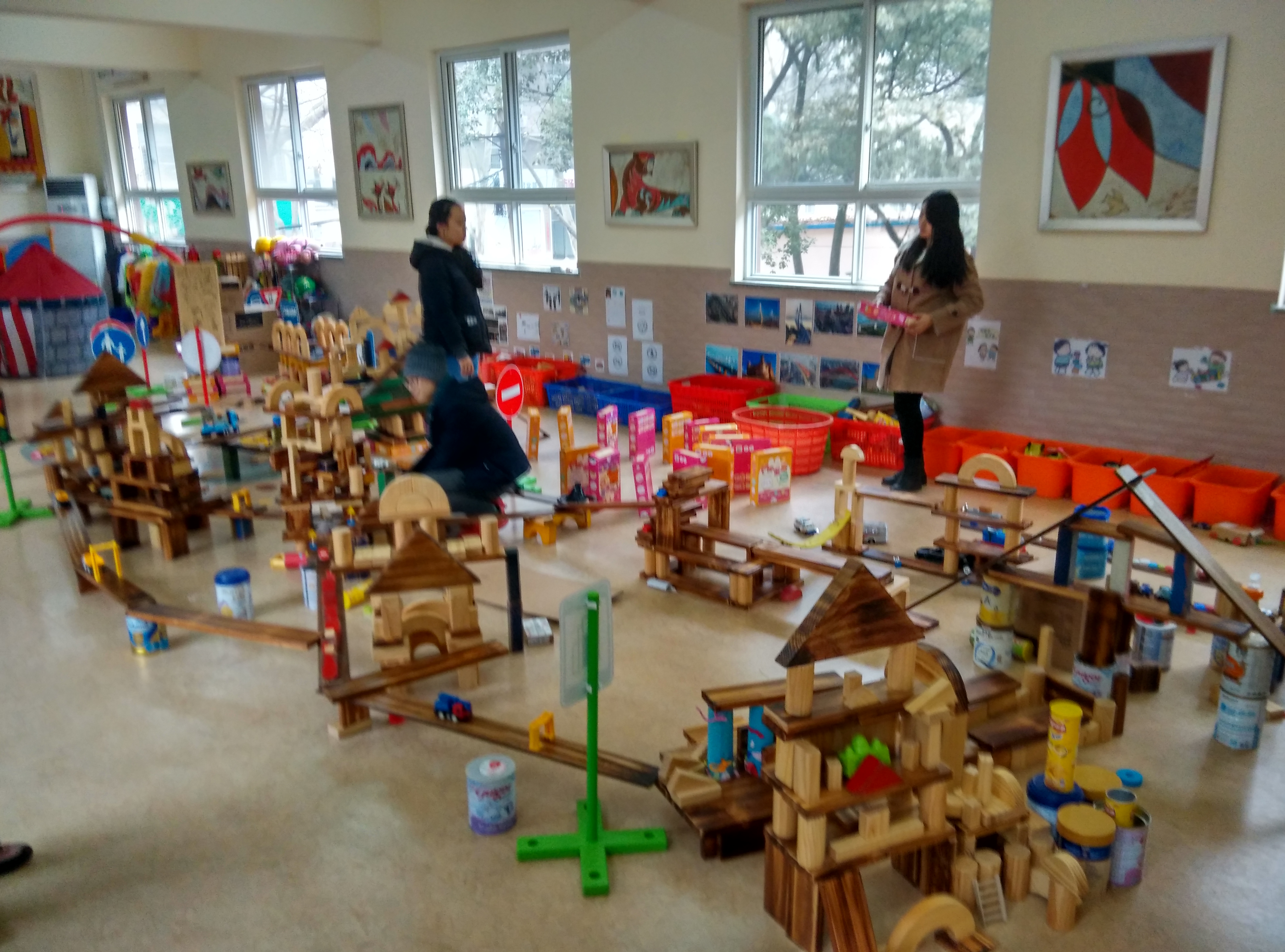 小朋友们用积木搭建出了道路、停车场、博物馆、公司、警察局、医院、飞机场等,创造出了一个生动活泼的城市。在搭建积木的过程中,志愿者们组织简单易懂的