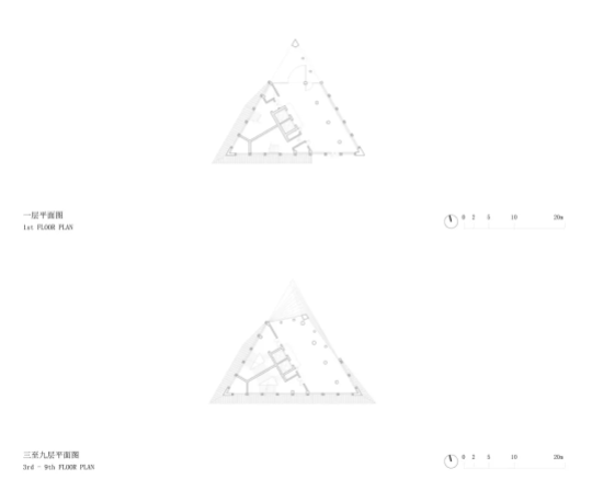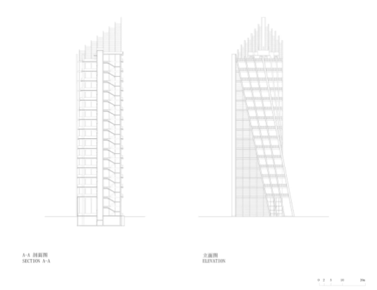 根据对视线的分析,我们对朝向彭家寨一侧的建筑形体进行旋转扭切,并使立面彻底开敞,逐层设置观景平台,形成多层级、多角度的视觉体验空间。