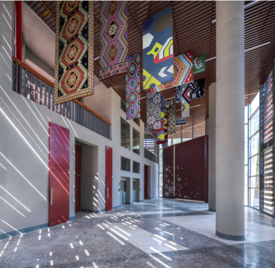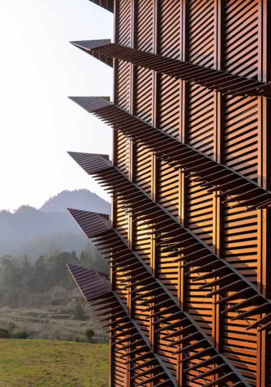 受消防规范制约,楼体采用钢筋混凝土结构,建筑外部如展翼的飞檐则采用当代胶合木,既彰显当代精神,也体现对土家族木构传统的致意。