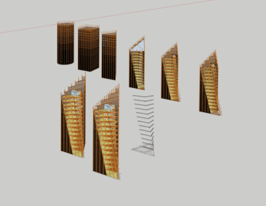 摩霄楼的形体以三棱柱为原型演化而来,设计关注建筑之看与被看的双重目标:迎着研学中心的主要人流来向,利用锐角所带来的透视效果以及木格栅立面的疏密渐变强化摩霄楼的体量感和直上云霄的气势,直线的楼体与周围曲折蜿蜒的自然地景形成对比。