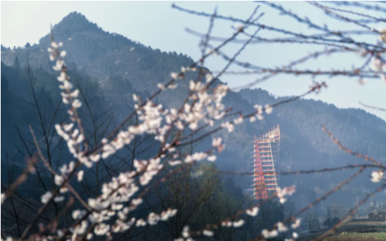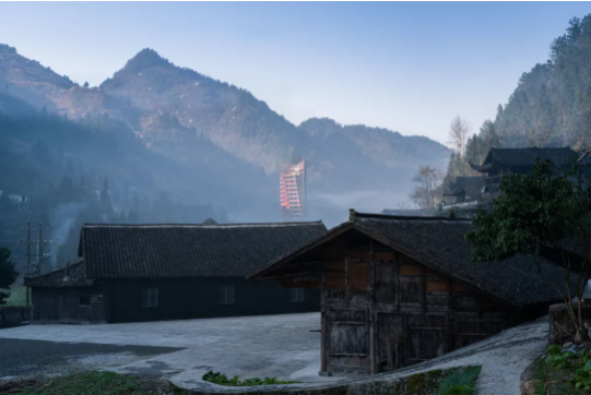 摩霄楼坐落于距彭家寨1千米之外的汪家寨,该寨的功能定位是国际研学营地,而设计摩霄楼目的有三:首先,设计希望创造一个可在空中观察彭家寨的高视点,在此,观者会产生与寨中完全不同的视觉体验。观者在彭家寨中体验的是局部微空间和建筑细部,而在摩霄楼上则可以清晰地识别土家族传统聚落的整体格局;其二,水畔建塔可以为滨水的、水平延展的建筑群落创造丰富的空间轮廓;其三,可以为整个景区和自由布局的研学建筑群设立有利于空间识别的标志物。