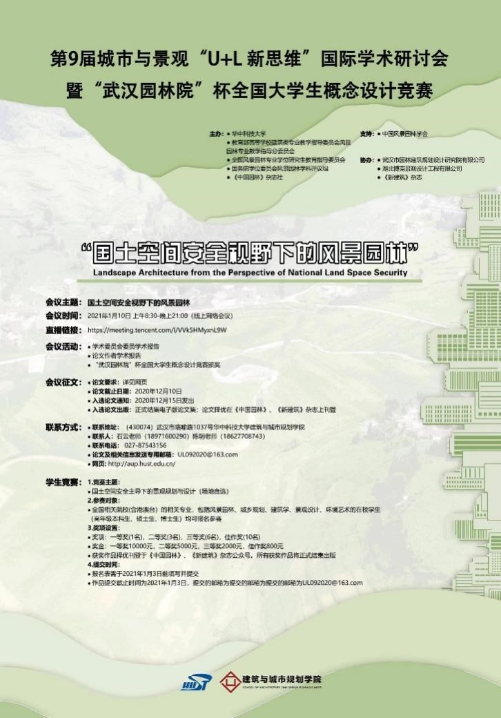 2021年1月10日,第9届城市与景观“U+L新思维”国际学术研讨会暨“武汉园林院”杯全国老员工概念设计竞赛将在线上召开。会议以“国土空间安全视野下的风景园林”为主题,紧扣时代脉搏,从风景园林的视角围绕理论、实践、教育三个议题展开。具体包括主题报告、优秀论文宣讲、设计竞赛颁奖三大板块。