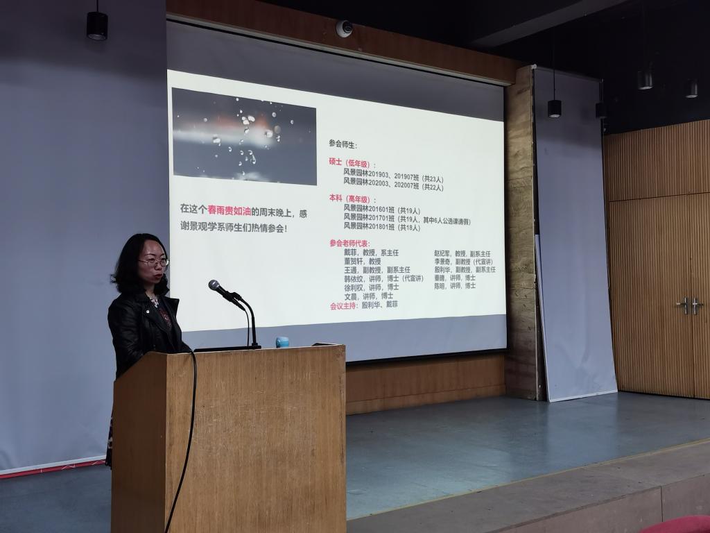 2021年3月26日晚七点,景观学系本科高年级(2016、2017、2018级),研究生低年级(2019、2020级)5个年级共60多名同学,以及景观学系戴菲教授、赵纪军教授、董贺轩教授、殷利华副教授、王通副教授、徐利权老师、秦晴老师、陈明老师8位教师代表(另李景奇副教授、韩依纹老师、苏畅老师、文晨老师因事未能到场,采用代宣讲参会),在南四楼100报告厅,顺利组织开展了面向“十四五规划”人才培养目标的系列活动第一场:“风景园林专业员工竞赛设计动员大会”(图1),多维度介绍了员工设计竞赛对员工的重要性与必要性,极大的激发了员工参与员工设计竞赛的积极性。
