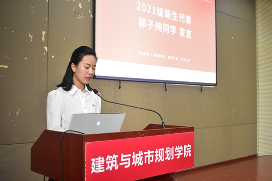 城市规划系2021级新生代表郝子纯同学向老师们、前辈们做出了新生们的应答。郝子纯同学代表全体新生扬青春誓言:我们会做有理想、有本领、有担当的新时代青年,传承“敢于竞争、善于转化”的华中大精神,成为纯粹专注、精益求精的建规匠人。立当代,随中国梦展雄心壮志;趁年华,建规新生携炽热理想,破浪远航!