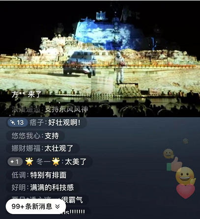 用户疯狂输出着“太酷炫了”、“很霸气”、“满满科技感”、“太有牌面了”等弹幕,互动不断,高潮迭起。