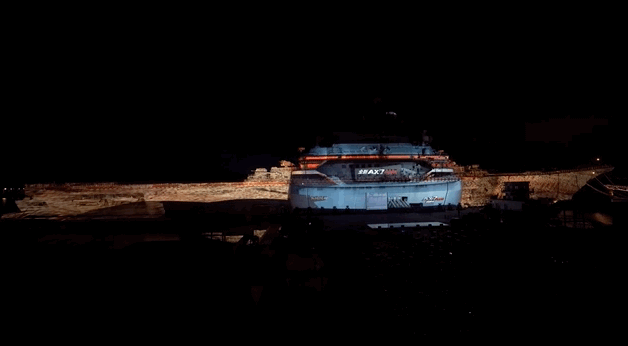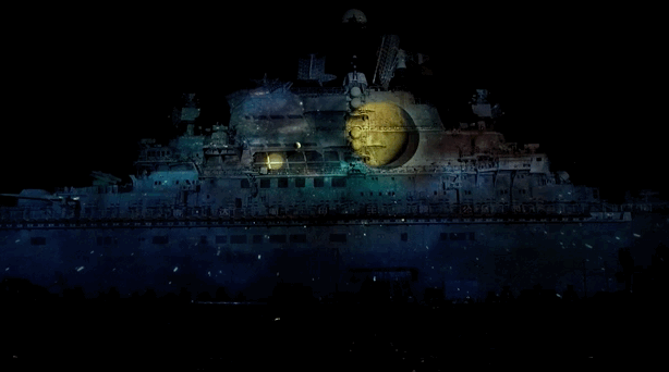 基辅号全长近300米,体量之大给投影秀的制作带来了重重困难,工程团队进行了大量的相机设定,寻找最佳角度,现场通宵测试效果,以期完美。