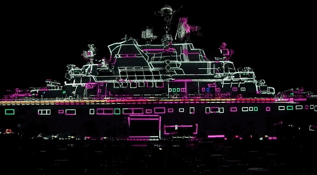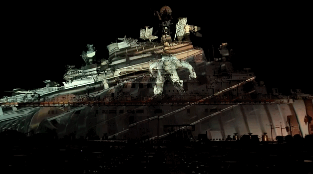 “基辅号”的体量之大给投影秀的制作带来了重重困难。此次投影的面积之大,需要使用42台40K工程投影机同时工作,覆盖“基辅号”航母的整个舰体。