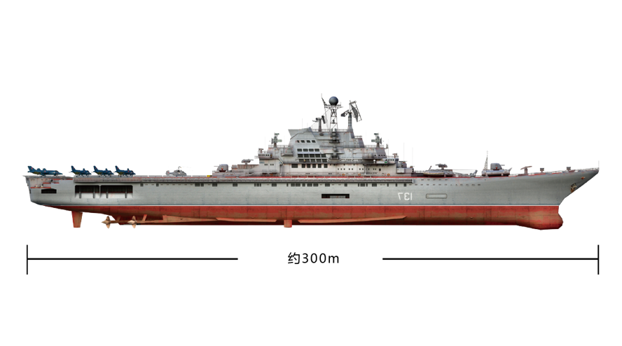 “基辅号”航母是前苏联“基辅”级航母的首制舰。建造于1970年,全长近300米,宽52.8米,全高61米,标准排水量32000吨。