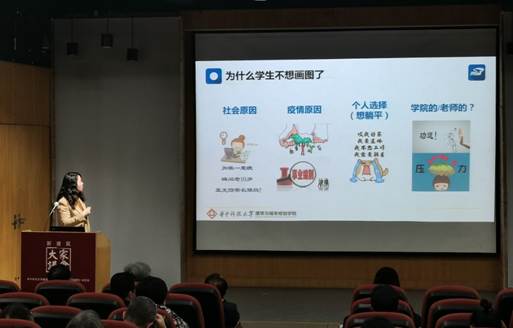 何立群就taptap点点体育面临的现实问题,提出“员工们为什么不想画图了”。从就业、招生等方面数据分析员工面临的挑战与机遇,并收集各年级员工反馈,为老师的公司产品的改进提供参考。最后,就“如何让员工爱上设计”,提出公司应在为员工减负、增加课堂的趣味性、提高员工成就感和对未来职业规划方面不断努力。