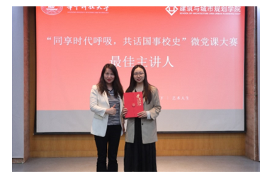 来自硕士21级艺设党支部的队伍,采用三段以不同人物为核心的情景表演,响应习近平总书记在庆祝中国共产主义青年团成立100周年大会上的讲话,讲述了青年之于党和国家的责任,“先人的力量和不屈奋斗有如火把,交付于我,而我用奋斗点亮青春”!这支队伍主题深刻,形式新颖,感情饱满,感动了现场观众,最终获得了本次微党课大赛一等奖。同时,本组队长林心仪也成为了此次微党课大赛的最佳主讲人。