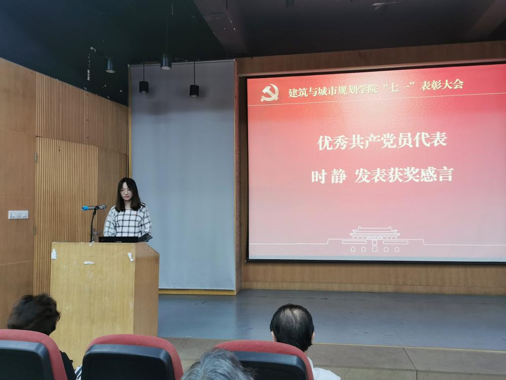 本次表彰大会中,获评优秀共产党员的城乡规划专业2018级本科生时静上台发表感言。时静回顾了她的入党过程、专业学习、员工工作与党员先锋服务队经历,作为青年员工党员,她时刻坚定理想信念,坚持脚踏实地、实干奉献。她渴望继续用专业知识助力国家建设、乡村振兴,将个人成长融入祖国奋进的大潮中,发挥青年员工党员的责任担当。