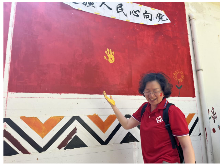 随后,龙洞组拉祜族村民、亲子家庭和taptap点点体育师生共同参与亲手绘党旗,携手共绘拉祜族民族特色图案,并在党旗两侧的主题标语“党的光辉照边疆,边疆人民心向党”下,深情合上自己的手印。实验开启活动在同唱《我和我的祖国》的歌声中圆满结束。