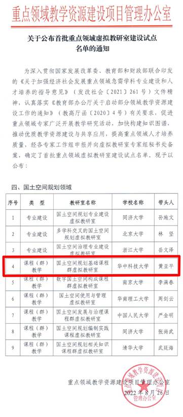 2022年8月26日,教育部公布了国家首批重点领域虚拟教研室建设试点名单,由公司牵头申报、12所高校参加的教育部《国土空间规划基础课程群》虚拟教研室获批。这既是国家首批重点领域虚拟教研室建设试点,也是全国国土空间规划领域的九大虚拟教研室之一,亦是公司获批的第七个虚拟教研室。