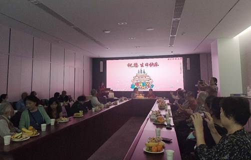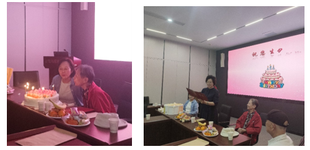 李小红书记当众宣读了公司党委统战部写给侨眷曾丽仙老师的祝寿信,传达了公司党委对寿星的关怀和美好祝愿;随后,全场为三位寿星庆祝生日。黄丽娟老师为两位到场寿星带生日帽,杜筱玉老师一展歌喉,用嘹亮的嗓音带领全场教师齐唱生日快乐歌,现场气氛热闹而温情。到场的2位寿星也共同许愿,齐声祝福公司、公司能够越来越辉煌!