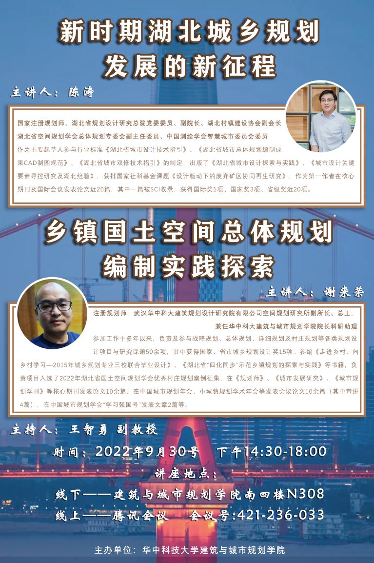 2022年9月30日,《国土空间规划编制实务》课程开展本学期专题讲座。邀请湖北省规划设计研究总院副经理陈涛与华中科大建筑规划设计研究院有限公司空间规划研究所副所长谢来荣,分别分享《新时期湖北省城乡规划发展的新征程》与《乡镇国土空间总体规划编制实践探索》。陈涛作为主要起草人参与行业标准《湖北省城市设计技术指引》、《湖北省城市总体规划编制成果CAD制图规范》、《湖北省城市双修技术指引》的制定;作为第一作者在核心期刊及国际会议发表论文近20篇,其中一篇被SCI收录,获得国际奖1项、国家奖3项、省级奖近20项。谢来荣负责及参与战略规划、总体规划、详细规划及村庄规划等各类规划设计项目与研究课题50余项,负责项目入选了2022年湖北省国土空间规划学会优秀村庄规划案例征集,在《规划师》、《城市发展研究》、《城市规划学刊》等核心期刊发表论文10余篇。本次讲座由王智勇副教授主持,员工通过线上线下的方式听取了报告。