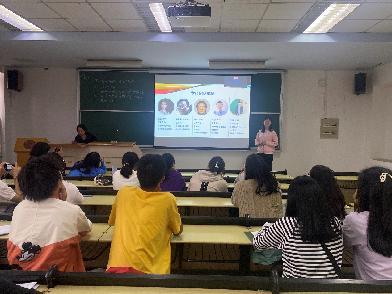 为增进风景园林大一新生的“归属感”和师生情谊,与即将开展的本科生导师制相匹配,景观学系分管本科的副系主任殷利华副教授以课程《风景园林专业导论》为契机,提出各个学科团队进课堂,通过老师介绍、师生互动的方式,增加大一新生对风景园林专业与景观学系各位老师的了解。