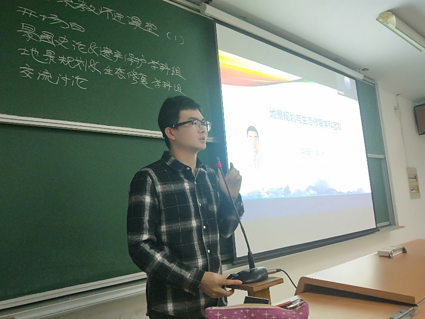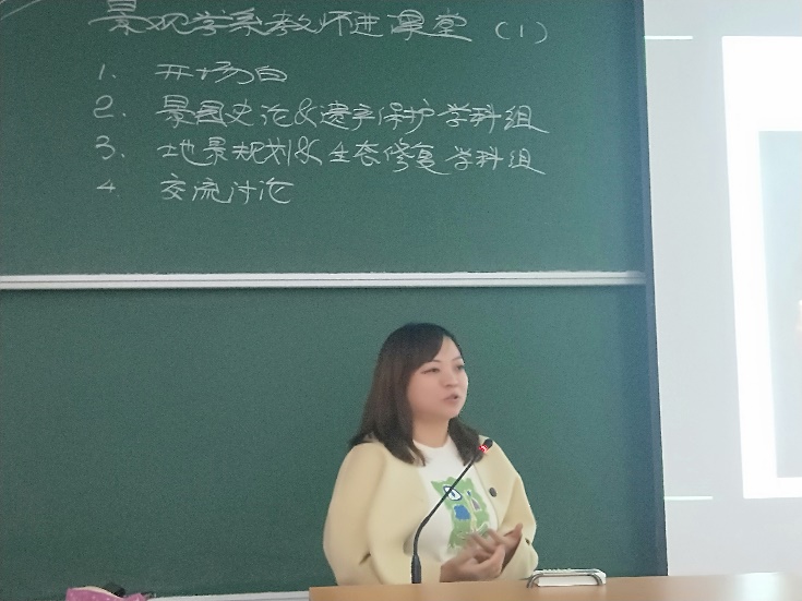 教学活动由殷利华老师主持,说明了本节课程的总体安排,并简要介绍景观学系的学科团队总体情况。第一节课,由“风景园林历史与理论”学科团队的赵纪军、王通、秦晴三位老师分别进行个人情况的介绍,第二节课,由“地景规划与生态修复”的戴菲、龚建、陈明三位老师分别介绍,最后由殷老师进行本次教学活动的总结。
