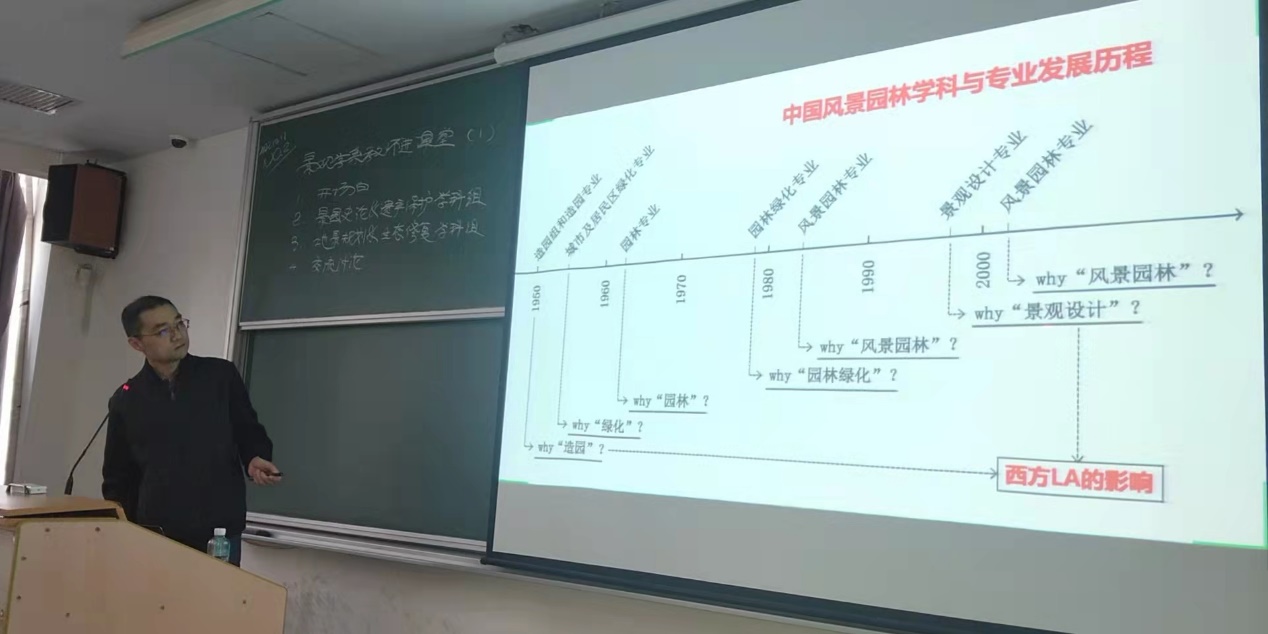 赵纪军老师结合着自身的研究方向,向同学们介绍了中国风景园林学科与专业发展历程,从造园组和造园专业到风景园林的转变过程,让同学们认知到风景园林是一门“古老而年轻”的学科,蕴含着优秀的中国传统文化内涵。