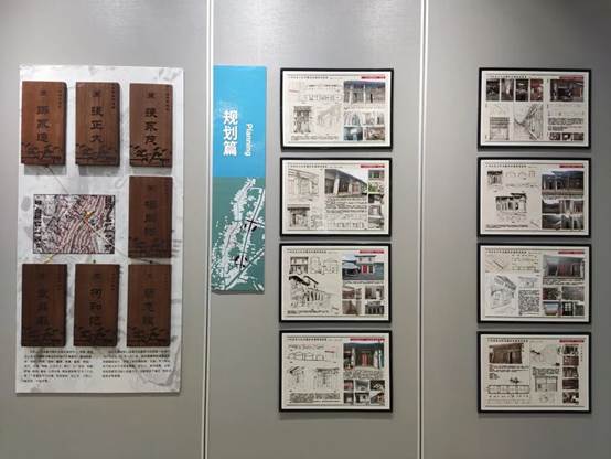 随后,一行人来到了“规划篇”和“建筑篇”中,看先锋队创新性地以手绘的表现方式,将队员们顶着烈日挨家挨户调研访谈梳理出来的四十余个活态店铺的结构特征、历史故事通过平面测绘和实地访谈的方式保留下来。此外,展览将对小河古镇张正太纸店、粮站、供销社的建筑改造方案以渲染图的方式进行直观表达,让大家身临其境地感受小河古街即将迎来的变化。先锋队队员在店铺改造过程中,积极畅想着未来的古街以改造后的建筑为基础,吸引孩子们暑假的时候来古街参加夏令营活动,以此活化古街的商业形式的美好蓝图。