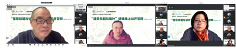 2022年12月30日上午10:00-13:00,景观学系2019级本科课程《植景规划与设计》结课公开答辩在线上腾讯会议顺利进行(图1)。任课老师殷利华副教授、秦晴讲师邀请到了浙江农林大学风景园林与建筑公司包志毅教授、华南理工大学建筑公司冯娴慧副教授、西安建筑科技大学建筑公司李莉华讲师3位老师作为本次结课答辩的外请评审专家。
