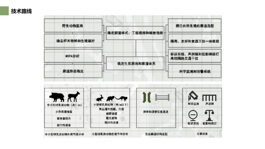 武汉喻家山和马鞍山森林公园地处东湖风景名胜区边缘,紧临光谷商圈等城市建成区,周边有大量交通线分割包围。团队于2021年4月起在上述两处地区利用红外监测相机展开科学研究,共记录到哺乳类动物10种,公园及周围存在野生动物种群或个体移动现象,但被交通分隔,修建跨越交通的生态廊道变得迫切。在查阅文献和咨询专家基础上选取了具有典型性和代表性的五种哺乳类动物进行生态廊道设计。借助MSPA确定廊道潜在选址并实地踏勘;针对不同哺乳动物生物特征和生境偏好设计了廊桥和涵管两种迁移方式,并根据其自然状态下的食物结构,种植相应植物,开挖水洼,拟提高廊道使用效率。充分地考虑了季节因素,通过部分特殊植物种植使野生动物在秋冬季也能获得相对充足的食物源(图7)。