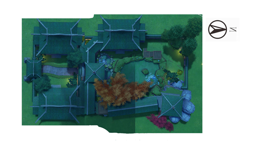 采用“元神”游戏中仙人洞府所需采用古典园林建筑进行外界构型,在较为平坦场地东北侧构型了一座小山。利用建筑材料的屏障效果,将整个场地分为三部分,用围墙构成荒野中庭院空间。植被选型中,选用了游戏中常见的垂香木(柏树)、枫树(红枫)、却砂木(银杏树)作为整个庭院最上的乔木层,灌木层采用了绣球花、杜鹃等植物,配合庭院中水鱼共融的场地,采用月莲(睡莲)来组成水景。夜景方面,采用了游戏中的夜景植物(帕蒂沙兰)作为房间灯光的衬托,希望营造“野致”状态下的仙境庭园景观(图6)。