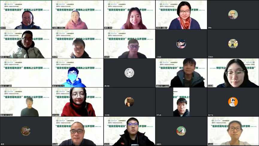 五组同学结合各自选定的场地,从选址论证、现状调查、问题解决和场地设计依次进行成果答辩。每组设计各具特色,在主题把握、设计规范以及深度上,得到了评审专家们的一致好评。同时,评审专家也针对各组不足提出了相应的指导改进建议。最后,任课老师殷利华、秦晴对同学们的设计成果给予充分的肯定,再次感谢专家宝贵点评和意见,并对大家新的一年寄寓祝福,线上合影(图8),《植景规划与设计》结课线上公开答辩顺利结束。