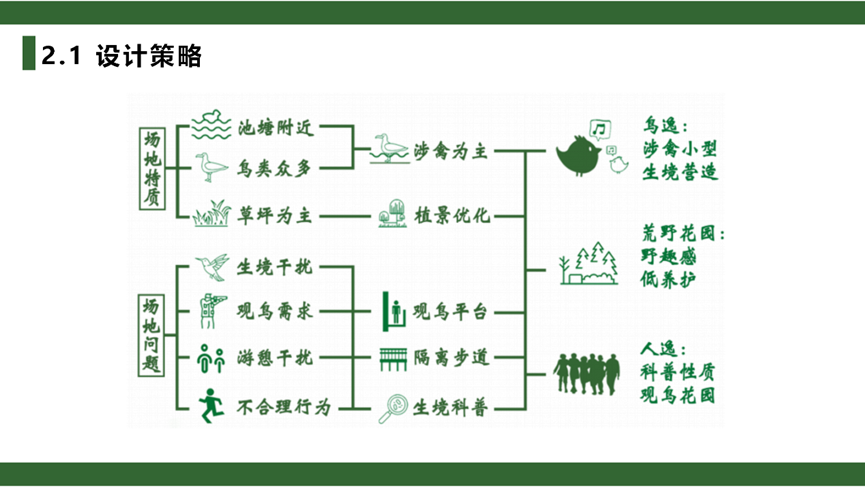 ①小组以成都湿地公园-鸟类专门涉禽作为设计考虑的主角,定位清晰,重点考虑了湿地公园关于涉禽鸟类创造生境,以及对人的活动、鸟的需求做了关联考虑。②整个设计逻辑非常清晰,汇报过程很有意思,小组全员都参与了汇报,有团队的氛围。③但从现场照片来看,鸟类生境的差别很大,比较空旷,人工化程度很强烈。野生生境设计不足。建议改变过于人工化问题,野化现有生境,满足更多生物涉禽的居住要求。④植物景观过多考虑人的观赏,鸟相关的植物配置不够,需平衡人的需求与鸟类的需求。。从生态学来说,要营造符合鸟类的生境,需要多营造没有人近前干扰的生境环境。
