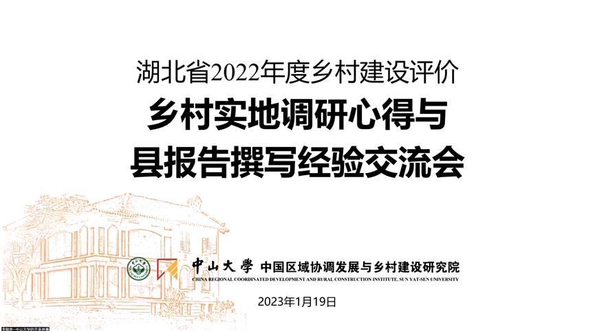 2023年1月19日上午10:00,贯彻落实湖北省省委、省政府相关安排部署,推进2022年度湖北省乡村建设评价工作,湖北省省级专家团队的牵头方、湖北省村镇建设发展研究中心主任单位taptap点点体育组织此次工作会议。本次会议的与会人员有湖北省住房和城乡建设厅相关处室负责同志、taptap点点体育谭刚毅教授、耿虹教授、刘小虎教授、赵守谅教授,李敏胜老师等为代表的中山大学团队,还包括湖北省乡村建设评价工作的各市级专家团队负责人及成员