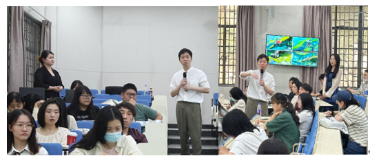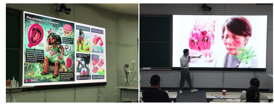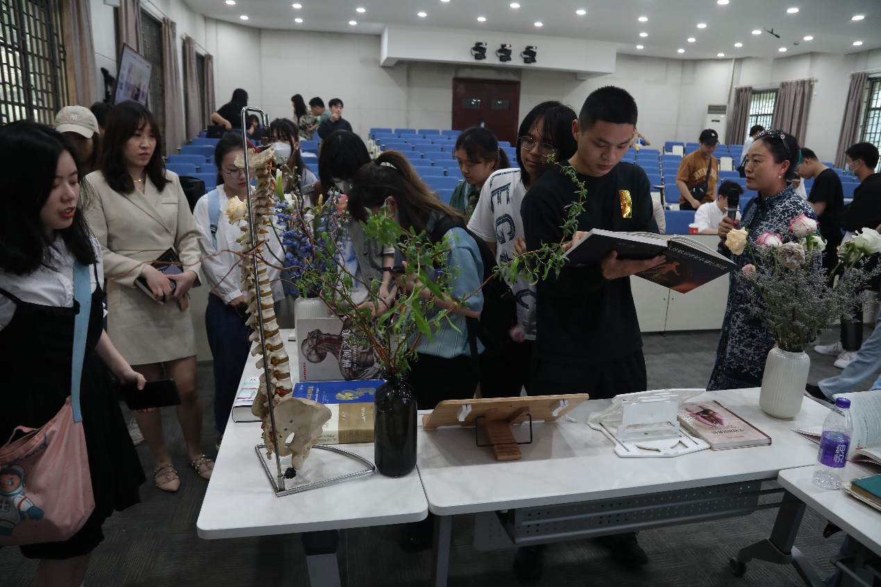 本次读书会共分为三个主要环节,第一部分是周舒扬老师“浅谈医学可视化”主题讲座;第二部分是同学们与嘉宾现场交流,一对一答,气氛轻松活跃;第三部分为自由交流、书籍展示和阅读,同学们对现场展示的人体骨骼模型、脊柱模型、人体解剖书籍产生浓厚兴趣。