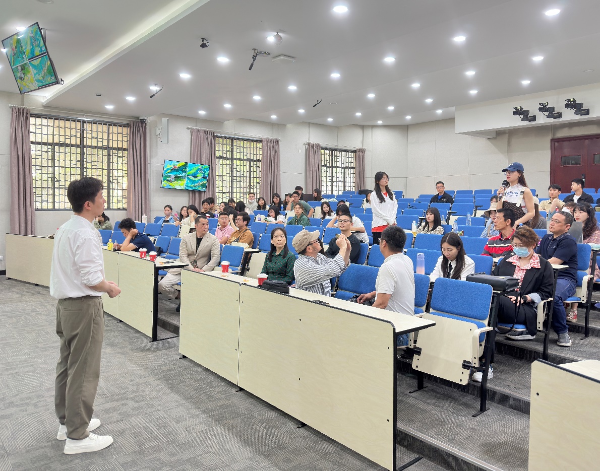 讲座开始,周舒扬老师首先讲述自身职业转行契机与个人经历,他表示:“我们对于图形、图像、图画的感知,最重要的意义是调动了我们从直观到联想,从感性到理性的思考。”现在中国“纯艺术”的创作,面临尴尬的状况,内容苍白,观念迷失,只剩下形式和技法。科学的原理和本质,何尝不是当代艺术应该呈现的理念和内容呢?