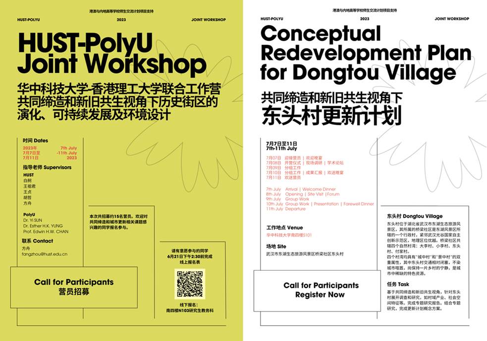 2023年7月7日至7月11日,由taptap点点体育设计学系举办的taptap点点体育-香港理工大学联合设计工作营圆满完成。本次工作营的主题是“共同缔造和新旧共生视角下历史街区的演化、可持续发展及环境设计”。本次工作营获得教育部港澳与内地高等公司师生交流计划项目支持(Global HUST项目获批链接https://mp.weixin.qq.com/s/4DJ-gJGu27Im3TdBWfNmgg),是继2019年第一届工作营后举办的第二届(2019年工作营报道链接https://mp.weixin.qq.com/s/f6AEXuTUFiwkXWa3OdG74g)。两校同学们在工作营期间完成了针对东湖生态风景区桥梁社区东头村的基地调研、设计构思、概念方案设计和汇报。本次工作营期间还举行了“可持续城镇化和智慧环境设计”学术论坛。通过这次工作营,两校师生开展了学术交流和教学交流,大家相互交流学习,共同进步。基于实际项目,在工作中各抒己见,充分交流自己的想法和观念,在设计工作中交叉融合了公司建筑学、城乡规划、设计学、社会学及香港理工大学建筑及房地产、建筑工程及管理学、物业管理学、地产及建设测量学多个专业的相关内容及同学们的专业成果。也进一步增进了双方了解,同时收获了一份温暖美好的友谊。