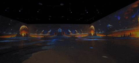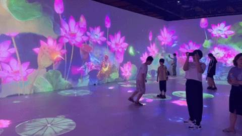 从流动的宇宙到粒子的星河,从灵动秀美的荷塘月色到古色古香的水墨画卷......《沉浸光影空间》以人工智能生成艺术创作(AIGC)技术与数字艺术为手段,以15K分辨率的高清激光投影设备为支撑,将具有科技感和魔幻感的数字影像,填满了135㎡空间的四壁和地板,创造了身临其境的视听体验。