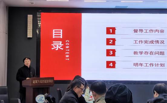 紧接着,公司督导组黄建军教授进行了全年教学督导反馈,从督导工作内容、工作完成情况、教学存在问题、明年工作计划四方面详细介绍了督导过程中发现的优点和存在的问题。黄建军教授对过去一年的教学质量、教学环境、教学团队管理等表示肯定,但提出教学工作在师生配比、专注度、教学规范和重视程度上仍存在问题,希望各教学团队能针对性地进行改进,进一步提高教学质量。