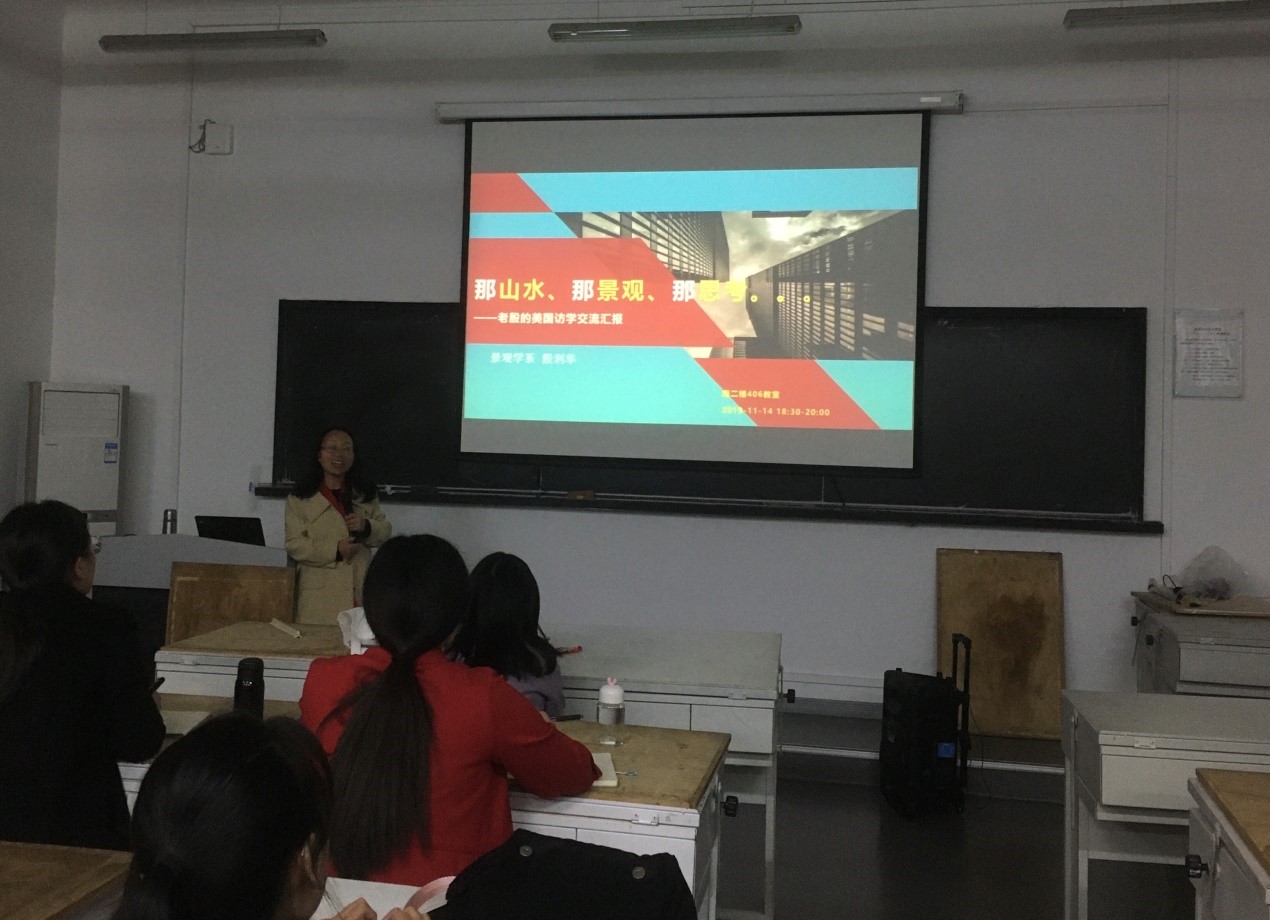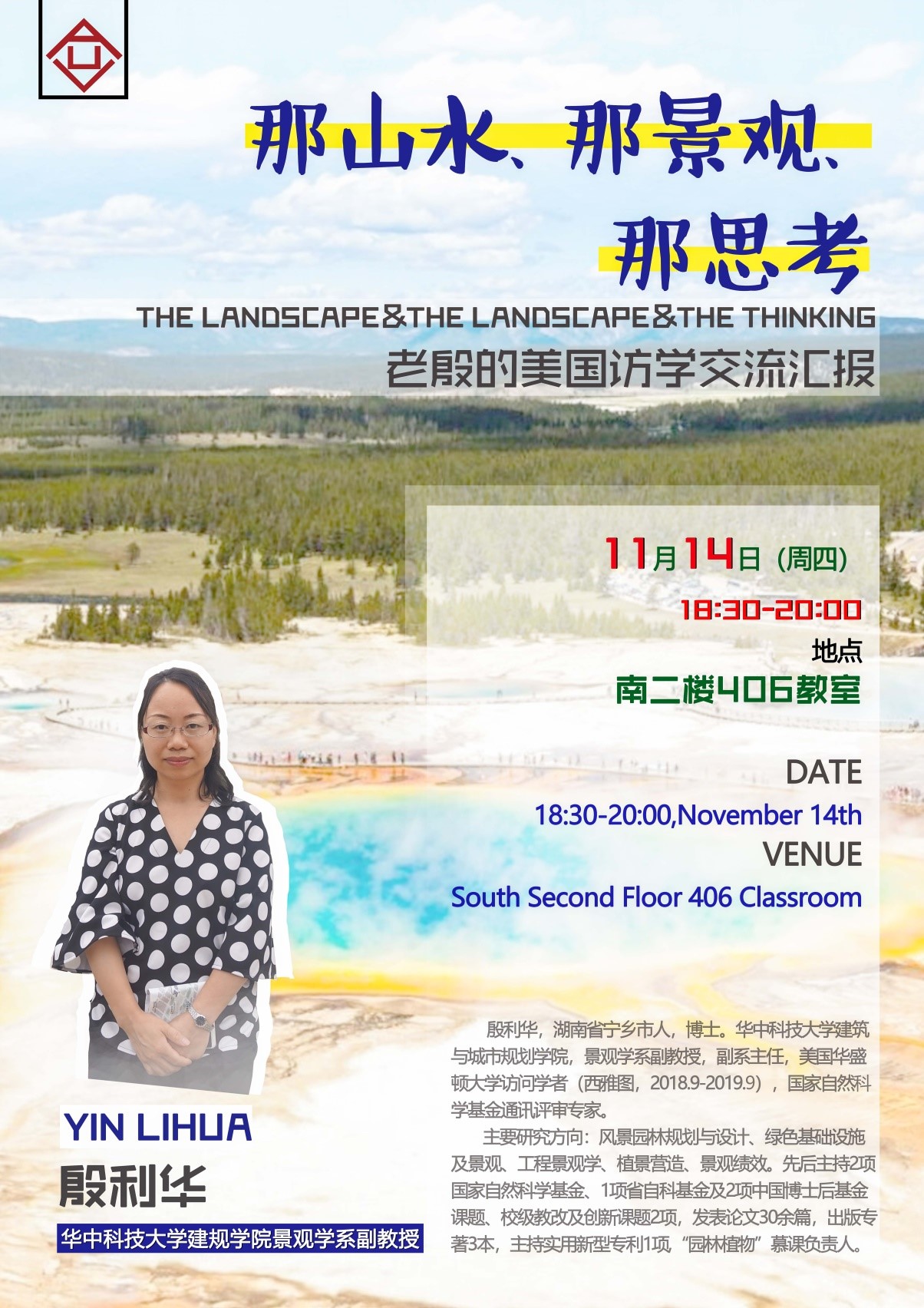 2019年11月14日晚6:30-8:00,景观学系副教授殷利华在南二楼402教室举办了主题为“那山水,那景观,那思考——老殷的美国访学交流汇报”的讲座。从拥有不同寻常的生态系统的美国国家公园,到美丽的普吉海湾、华盛顿湖,再到绿色基础设施十分完善的西雅图的城市景观,殷老师娓娓道来,分享了在美访学一年来的所见所闻、所思所感。