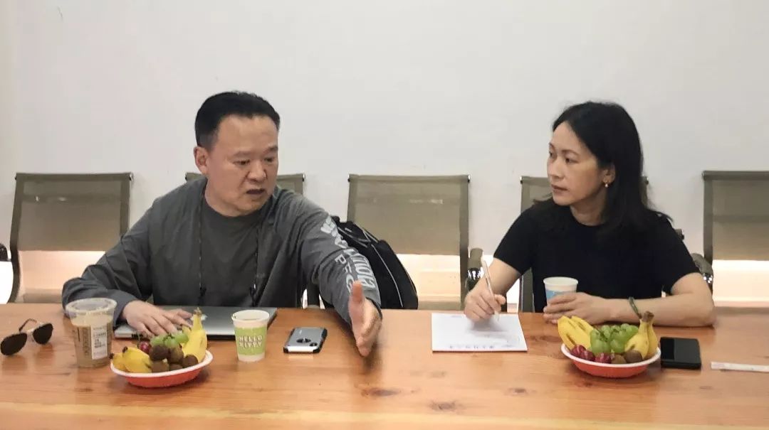 ▲谭力勤教授与张健教授讨论数媒专业创新发展路径