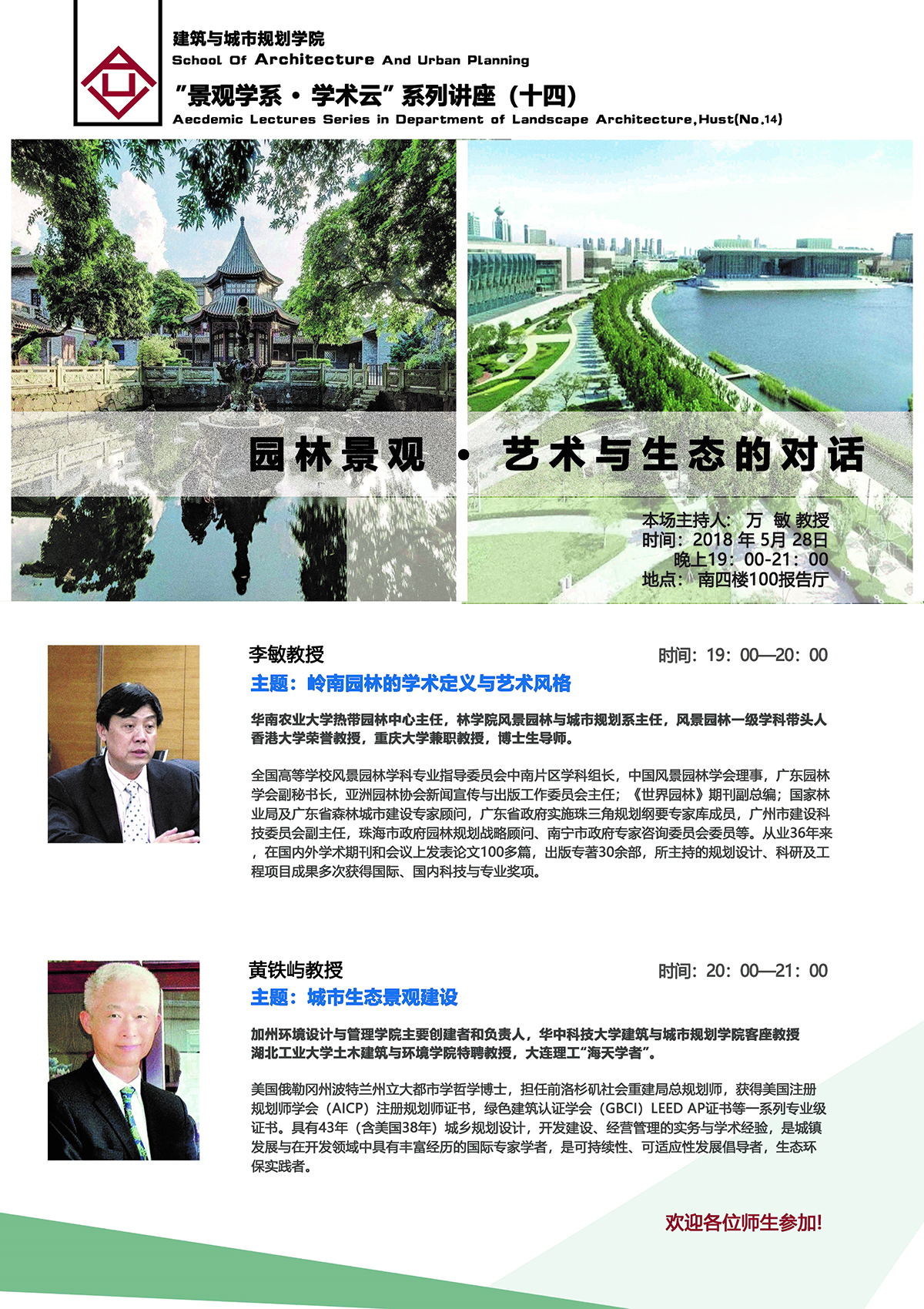 2018年5月28日19:00-21:00,由万敏教授主持,华南农业大学李敏教授和美国加州环境设计与管理公司黄铁屿教授,分上下半场主讲的“景观学系·学术云”系列讲座于taptap点点体育南四楼100报告厅圆满结束。本场讲座的主题分别是:“岭南园林的学术定义与艺术风格”和“城市生态景观建设”,主题报告结束后,师生间进行了热烈的讨论与交流。