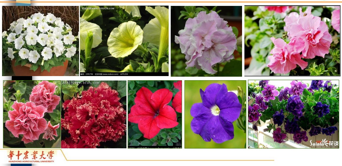 “一种多色”,如矮牵牛不同品种多种色彩(图6),从白色,红色到紫到蓝色等等,是目前色彩最多的园艺花卉种之一。同时胡老师也介绍说目前矮牵牛缺乏金黄色品种,这是现在矮牵牛园艺育种目标。