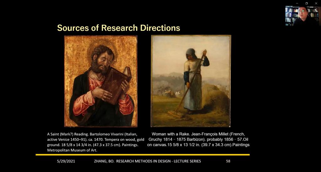 张波老师首先以何为研究为切入点,指出研究在日常生活中无处不在,涉及到搜集材料,分析判断、得出结论的过程。随后,他区分了学术研究与日常研究的不同,并提出学术研究应该具有可被推翻,扩展,细化的可能性。同时,他介绍了设计学科的学术研究与普通学术研究的不同,提出设计学科在研究方法上的综合与转变,并介绍针对设计学科的相关研究,可以借鉴其他学科中的已有成熟研究方法。之后对选择学术论文题目的方法、研究问题的价值评估与可行性评估进行了经验分享与总结。