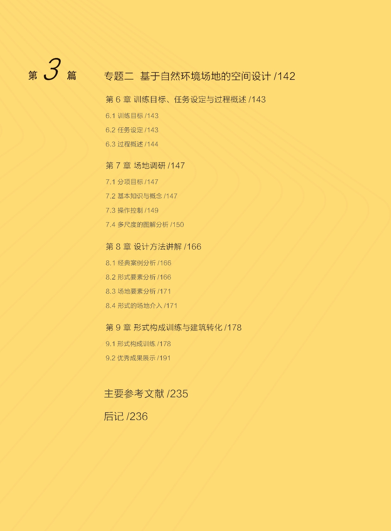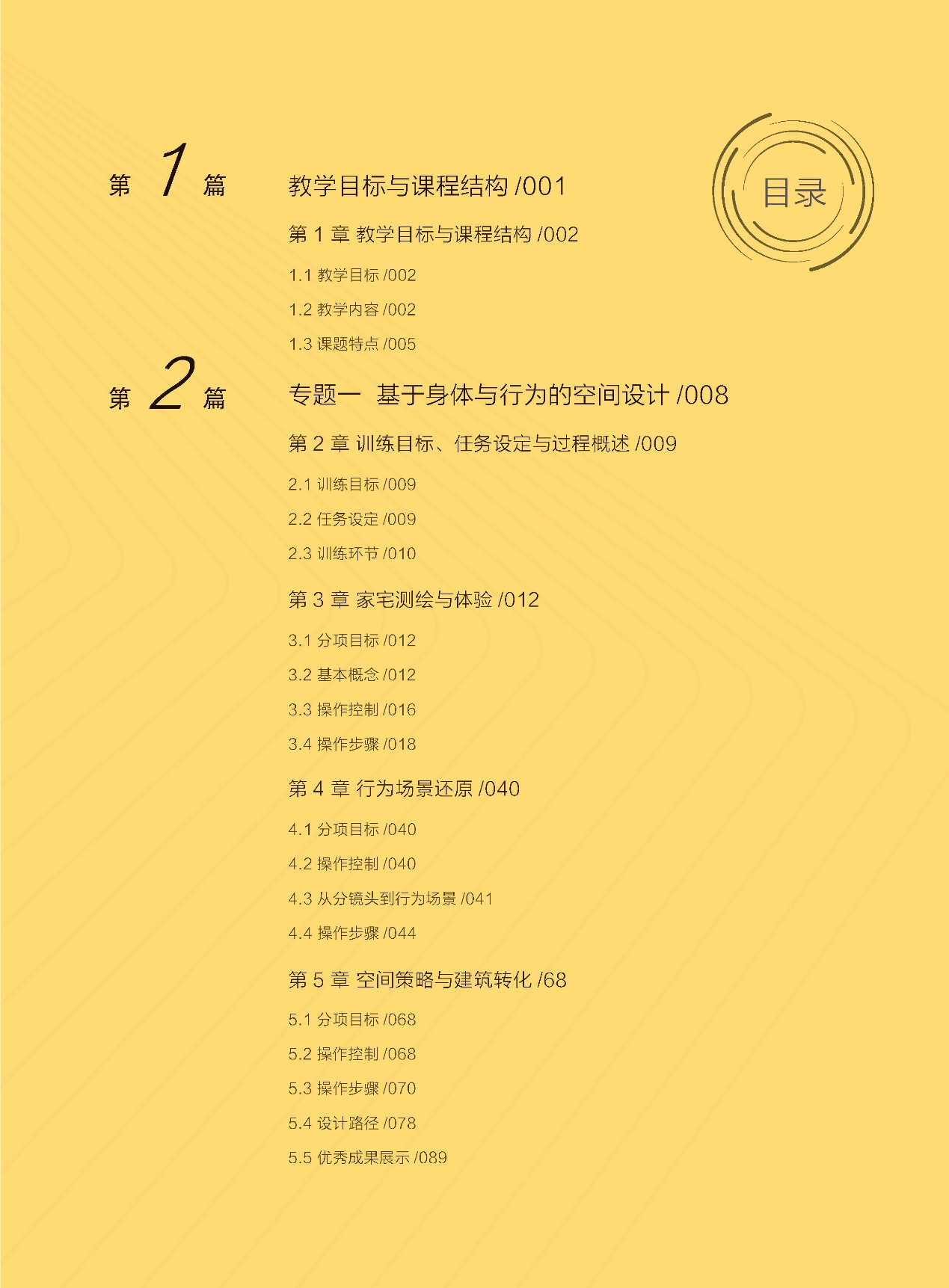 本教程融合了二年级教学组近六年来推进教改的教学积累,针对二年级上学期两个设计专题“空间使用:基于身体与行为的空间设计——理想家宅”与“场地响应:基于自然环境场地的空间设计——东湖书吧”,将题目设置、过程环节、优秀作业汇编成书,重点探讨了如何教授员工处理建筑与人的关系,以及建筑与环境的关系这两个建筑设计的基本问题。本书将作为华科二年级建筑设计课教程使用,也希望能够为兄弟院校的建筑设计教学带来有益的思考,同时可供对建筑设计基础教学感兴趣的朋友参考阅读。