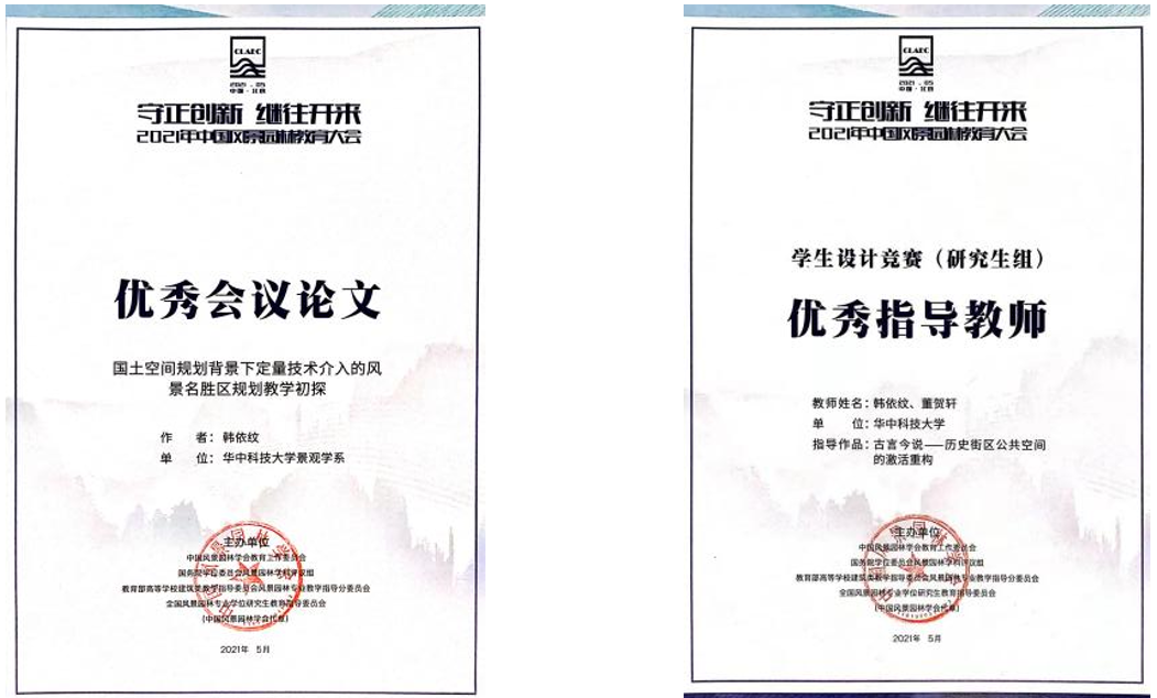 韩依纹老师凭借《国土空间规划视角下定量技术介入的风景名胜区规划教学初探》荣获优秀会议论文奖。